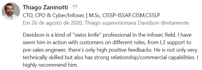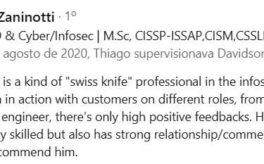 Sou um engenheiro de soluções com mais de 12 anos de experiência em cibersegurança, focado em fortalecer a segurança digital e a resiliência dos clientes através de soluções estratégicas.